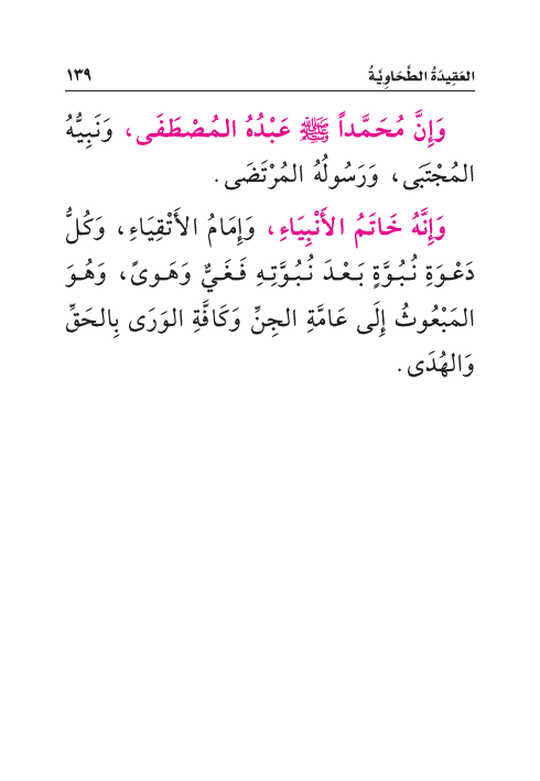 وَإِنَّهُ خَاتَمُ الأَنْبِيَاءِ، وَإِمَامُ الأَتْقِيَاءِ، وَكُلُّ دَعْوَةِ نُبُوَّةٍ بَعْدَ نُبُوَّتِهِ فَغَيٌّ وَهَوىً، وَهُوَ المَبْعُوثُ إِلَى عَامَّةِ الجِنِّ وَكَافَّةِ الوَرَى بِالحَقِّ وَالهُدَى.