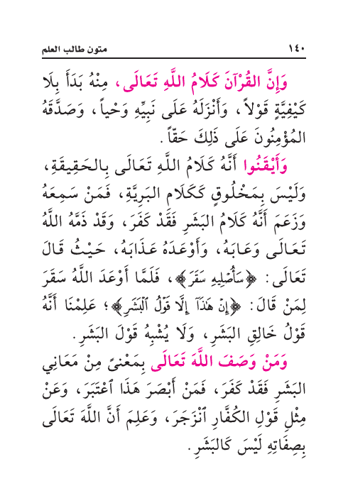 وَأَيْقَنُوا أَنَّهُ كَلَامُ اللَّهِ تَعَالَى بِالحَقِيقَةِ، وَلَيْسَ بِمَخْلُوقٍ كَكَلَامِ البَرِيَّةِ، فَمَنْ سَمِعَهُ وَزَعَمَ أَنَّهُ كَلَامُ البَشَرِ فَقَدْ كَفَرَ، وَقَدْ ذَمَّهُ اللَّهُ تَعَالَى وَعَابَهُ، وَأَوْعَدَهُ عَذَابَهُ، حَيْثُ قَالَ تَعَالَى: {سَأُصْلِيهِ سَقَرَ}، فَلَمَّا أَوْعَدَ اللَّهُ سَقَرَ لِمَنْ قَالَ: {إِنْ هَذَا إِلَّا قَوْلُ الْبَشَرِ}؛ عَلِمْنَا أَنَّهُ قَوْلُ خَالِقِ البَشَرِ، وَلَا يُشْبِهُ قَوْلَ البَشَرِ.
