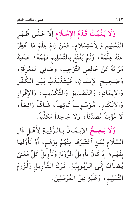 وَلَا يَثْبُتُ قَدَمُ الإِسْلَامِ إِلَّا عَلَى ظَهْرِ التَّسْلِيمِ وَالاِسْتِسْلَامِ، فَمَنْ رَامَ عِلْمَ مَا حُظِرَ عَنْهُ عِلْمُهُ، وَلَمْ يَقْنَعْ بِالتَّسْلِيمِ فَهْمُهُ؛ حَجَبَهُ مَرَامُهُ عَنْ خَالِصِ التَّوْحِيدِ، وَصَافِي المَعْرِفَةِ، وَصَحِيحِ الإِيمَانِ، فَيَتَذَبْذَبُ بَيْنَ الكُفْرِ وَالإِيمَانِ، وَالتَّصْدِيقِ وَالتَّكْذِيبِ، وَالإِقْرَارِ وَالإِنْكَارِ، مُوَسْوِساً تَائِهاً، شَاكّاً زَائِغاً، لَا مُؤْمِناً مُصَدِّقاً، وَلَا جَاحِداً مُكَذِّباً.
