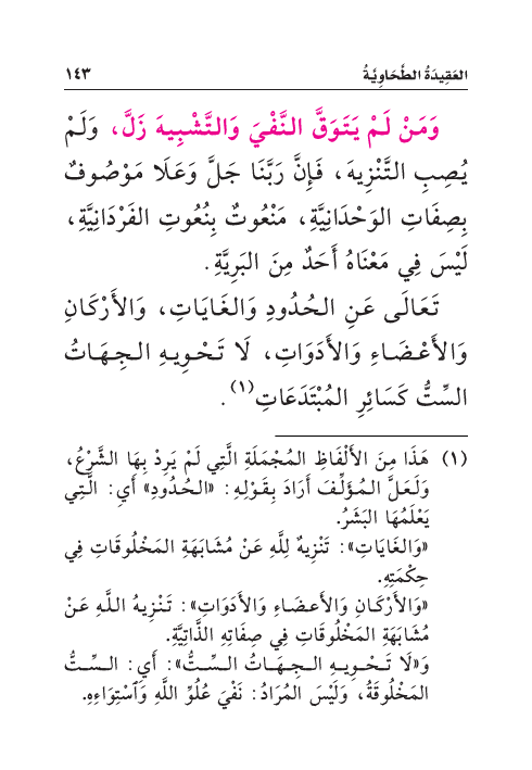 وَمَنْ لَمْ يَتَوَقَّ النَّفْيَ وَالتَّشْبِيهَ زَلَّ، وَلَمْ يُصِبِ التَّنْزِيهَ، فَإِنَّ رَبَّنَا جَلَّ وَعَلَا مَوْصُوفٌ بِصِفَاتِ الوَحْدَانِيَّةِ، مَنْعُوتٌ بِنُعُوتِ الفَرْدَانِيَّةِ، لَيْسَ فِي مَعْنَاهُ أَحَدٌ مِنَ البَرِيَّةِ.