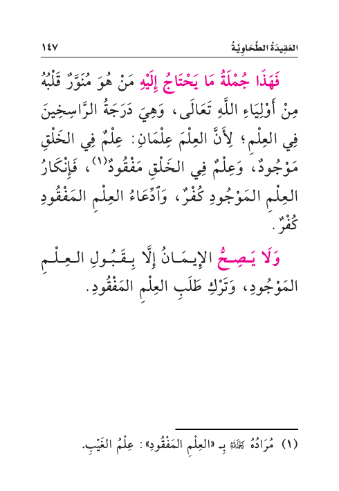 فَهَذَا جُمْلَةُ مَا يَحْتَاجُ إِلَيْهِ مَنْ هُوَ مُنَوَّرٌ قَلْبُهُ مِنْ أَوْلِيَاءِ اللَّهِ تَعَالَى، وَهِيَ دَرَجَةُ الرَّاسِخِينَ فِي العِلْمِ؛ لِأَنَّ العِلْمَ عِلْمَانِ: عِلْمٌ فِي الخَلْقِ مَوْجُودٌ، وَعِلْمٌ فِي الخَلْقِ مَفْقُودٌ (¬١)، فَإِنْكَارُ العِلْمِ المَوْجُودِ كُفْرٌ، وَادِّعَاءُ العِلْمِ المَفْقُودِ كُفْرٌ.