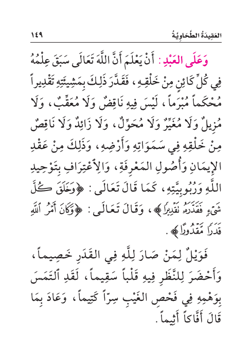 وَعَلَى العَبْدِ: أَنْ يَعْلَمَ أَنَّ اللَّهَ تَعَالَى سَبَقَ عِلْمُهُ فِي كُلِّ كَائِنٍ مِنْ خَلْقِهِ، فَقَدَّرَ ذَلِكَ بِمَشِيئَتِهِ تَقْدِيراً مُحْكَماً مُبْرَماً، لَيْسَ فيه نَاقِضٌ وَلَا مُعَقِّبٌ، وَلَا مُزِيلٌ وَلَا مُغَيِّرٌ وَلَا مُحَوِّلٌ، وَلَا زَائِدٌ وَلَا نَاقِصٌ مِنْ خَلْقِهِ فِي سَمَوَاتِهِ وَأَرْضِهِ، وَذَلِكَ مِنْ عَقْدِ الإِيمَانِ وَأُصُولِ المَعْرِفَةِ، وَالِاعْتِرَافِ بِتَوْحِيدِ اللَّهِ وَرُبُوبِيَّتِهِ، كَمَا قَالَ تَعَالَى: {وَخَلَقَ كُلَّ شَيْءٍ فَقَدَّرَهُ تَقْدِيرًا}، وَقَالَ تَعَالَى: {وَكَانَ أَمْرُ اللَّهِ قَدَرًا مَّقْدُورًا}.