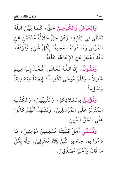 وَنَقُولُ: إِنَّ اللَّهَ تَعَالَى اتَّخَذَ إِبْرَاهِيمَ خَلِيلاً، وَكَلَّمَ مُوسَى تَكْلِيماً؛ إِيمَاناً وَتَصْدِيقاً وَتَسْلِيماً.