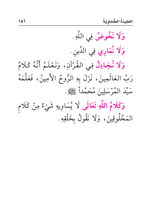 وَلَا نُجَادِلُ فِي القُرْآنِ، وَنَعْلَمُ أَنَّهُ كَلَامُ رَبِّ العَالَمِينَ، نَزَلَ بِهِ الرُّوحُ الأَمِينُ، فَعَلَّمَهُ سَيِّدَ المُرْسَلِينَ مُحَمَّداً صَلَّى اللهُ عَلَيْهِ وَسَلَّمَ.
