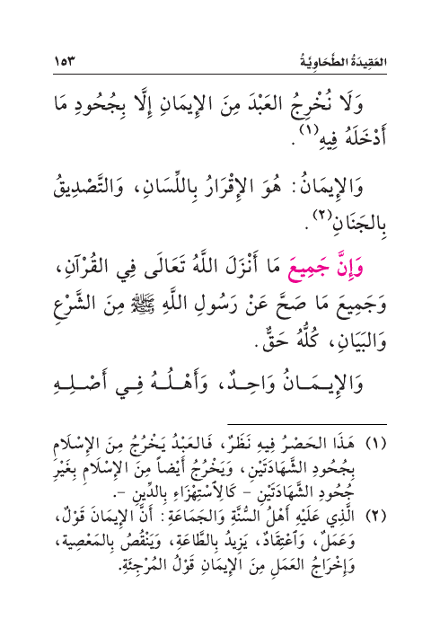 وَإِنَّ جَمِيعَ مَا أَنْزَلَ اللَّهُ تَعَالَى فِي القُرْآنِ، وَجَمِيعَ مَا صَحَّ عَنْ رَسُولِ اللَّهِ صَلَّى اللهُ عَلَيْهِ وَسَلَّمَ مِنَ الشَّرْعِ وَالبَيَانِ، كُلُّهُ حَقٌّ.