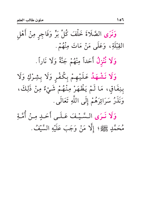 وَلَا نَرَى السَّيْفَ عَلَى أَحَدٍ مِنْ أُمَّةِ مُحَمَّدٍ صَلَّى اللهُ عَلَيْهِ وَسَلَّمَ؛ إِلَّا مَنْ وَجَبَ عَلَيْهِ السَّيْفُ.