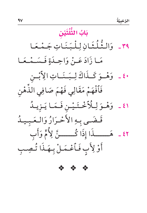 ٣٩ ـ وَالثُّلُثَانِ لِلْبَنَاتِ جَمْعَا ... مَا زَادَ عَنْ وَاحِدَةٍ فَسَمْعَا