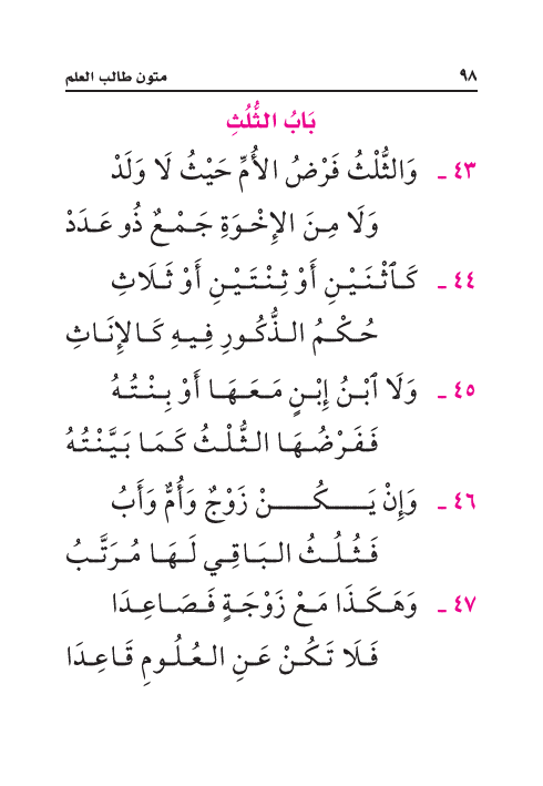 ٤٣ ـ وَالثُّلْثُ فَرْضُ الأُمِّ حَيْثُ لَا وَلَدْ ... وَلَا مِنَ الإِخْوَةِ جَمْعٌ ذُو عَدَدْ