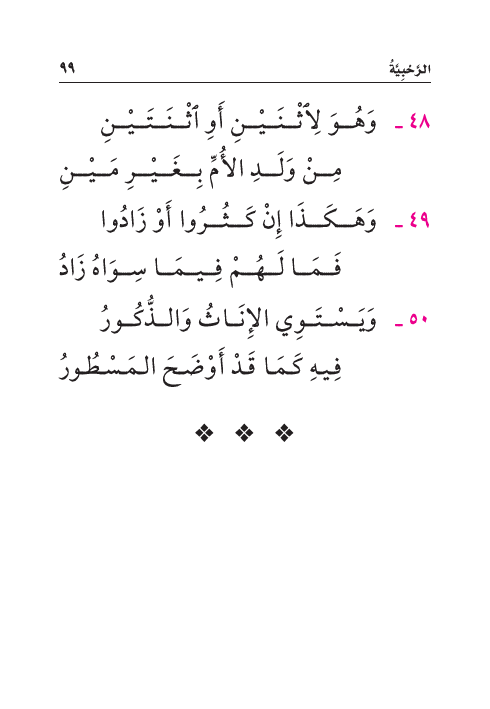 ٥٠ ـ وَيَسْتَوِي الإِنَاثُ وَالذُّكُورُ ... فِيهِ كَمَا قَدْ أَوْضَحَ المَسْطُورُ