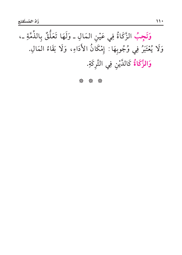 وَتَجِبُ الزَّكَاةُ فِي عَيْنِ المَالِ، وَلَهَا تَعَلُّقٌ بِالذِّمَّةِ، وَلَا يُعْتَبَرُ فِي وُجُوبِهَا: إِمْكَانُ الأَدَاءِ، وَلَا بَقَاءُ المَالِ.