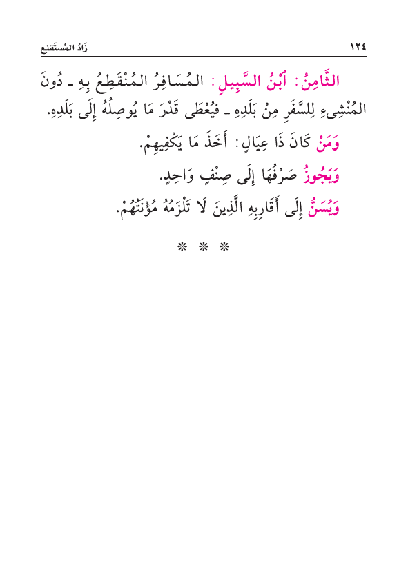 الثَّامِنُ: ابْنُ السَّبِيلِ: المُسَافِرُ المُنْقَطِعُ بِهِ - دُونَ المُنْشِئِ لِلسَّفَرِ مِنْ بَلَدِهِ - فيُعْطَى قَدْرَ مَا يُوصِلُهُ إِلَى بَلَدِهِ.