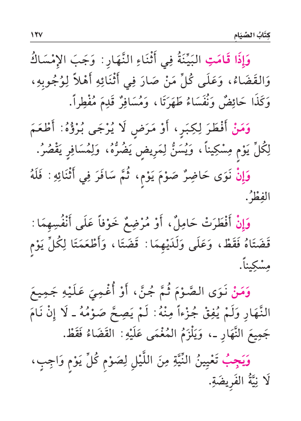 وَيَجِبُ تَعْيِينُ النِّيَّةِ مِنَ اللَّيْلِ لِصَوْمِ كُلِّ يَوْمٍ وَاجِبٍ، لَا نِيَّةُ الفَرَيْضِةِ.