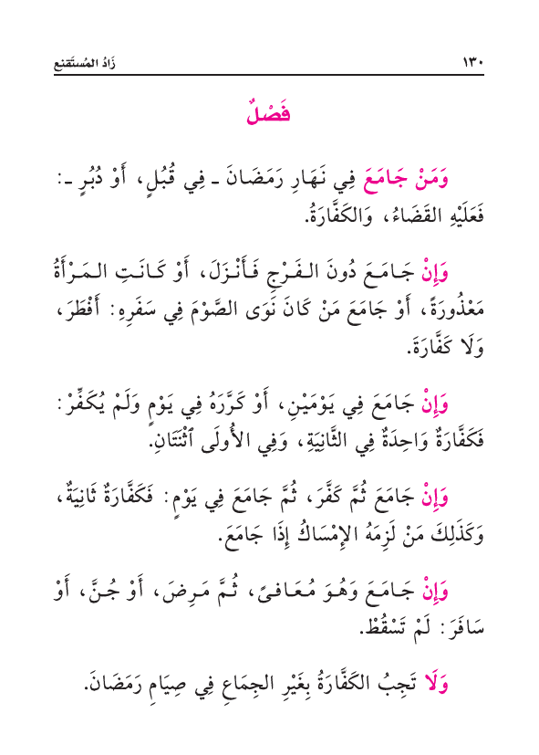 وَمَنْ جَامَعَ فِي نَهَارِ رَمَضَانَ فِي قُبُلٍ أَوْ دُبُرٍ: فَعَلَيْهِ القَضَاءُ، وَالكَفَّارَةُ.