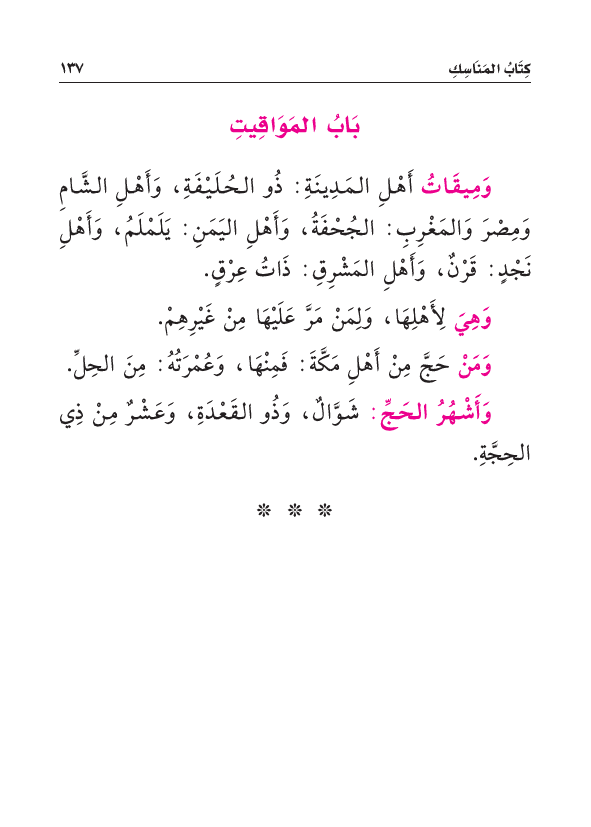 وَمِيقَاتُ أَهْلِ المَدِينَةِ: ذُو الحُلَيْفَةِ، وَأَهْلِ الشَّامِ وَمِصْرَ وَالمَغْرِبِ: الجُحْفَةُ، وَأَهْلِ اليَمَنِ: يَلَمْلَمُ، وَأَهْلِ نَجْدٍ: قَرْنٌ، وَأَهْلِ المَشْرِقِ: ذَاتُ عِرْقٍ.