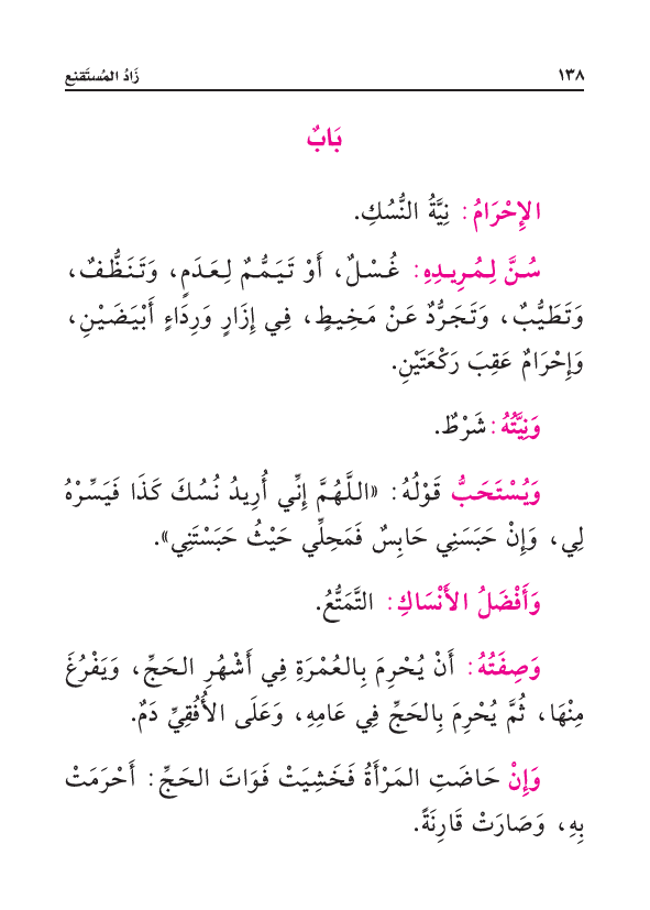 سُنَّ لِمُرِيدِهِ: غُسْلٌ، أَوْ تَيَمُّمٌ لِعَدَمٍ، وَتَنَظُّفٌ، وَتَطَيُّبٌ، وَتَجَرُّدٌ عَنْ مَخِيطٍ، فِي إِزَارٍ وَرِدَاءٍ أَبْيَضَيْنِ، وَإِحْرَامٌ عَقِبَ رَكْعَتَيْنِ.