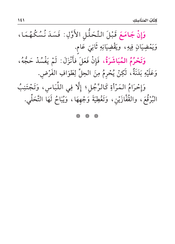 وَتَحْرُمُ المُبَاشَرَةُ، فَإِنْ فَعَلَ فأَنْزَلَ: لَمْ يَفْسُدْ حَجُّهُ، وَعَلَيْهِ بَدَنَةٌ، لَكِنْ يُحْرِمُ مِنَ الحِلِّ لِطَوَافِ الفَرْضِ.