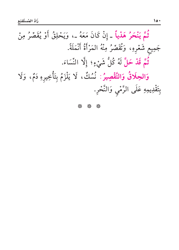 ثُمَّ يَنْحَرُ هَدْياً - إِنْ كَانَ مَعَهُ -، وَيَحْلِقُ أَوْ يُقَصِّرُ مِنْ جَمِيعِ شَعْرِهِ، وَتُقَصِّرُ مِنْهُ المَرْأَةُ أُنْمُلَةً.