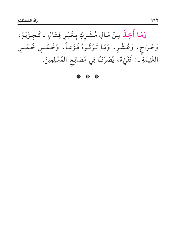 وَمَا أُخِذَ مِنْ مَالِ مُشْرِكٍ بِغَيْرِ قِتَالٍ - كَجِزْيَةٍ، وَخَرَاجٍ، وَعُشْرٍ، وَمَا تَرَكُوهُ فَزَعاً، وَخُمُسِ خُمُسِ الغَنِيمَةِ - فَفَيْءٌ، يُصْرَفُ فِي مَصَالِحِ المُسْلِمِينَ.