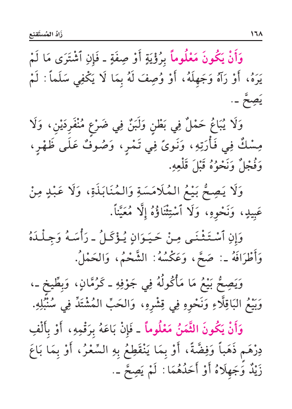وَأَنْ يَكُونَ الثَّمَنُ مَعْلُوماً - فَإِنْ بَاعَهُ بِرَقْمِهِ، أَوْ بِأَلفِ دِرْهَمٍ ذَهَباً وَفِضَّةً، أَوْ بِمَا يَنْقَطِعُ بِهِ السِّعْرُ، أَوْ بِمَا بَاعَ زَيْدٌ وَجَهِلَاهُ أَوْ أَحَدُهُمَا: لَمْ يَصِحَّ -.