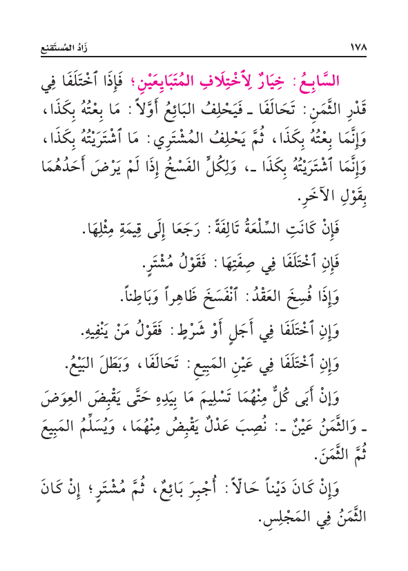 السَّابِعُ: خِيَارٌ لِاخْتِلَافِ المُتَبَايِعَيْنِ؛ فَإِذَا اخْتَلَفَا فِي قَدْرِ الثَّمَنِ: تَحَالَفَا - فَيَحْلِفُ البَائِعُ أَوَّلًا: مَا بِعْتُهُ بِكَذَا، وَإِنَّمَا بِعْتُهُ بِكَذَا، ثُمَّ يَحْلِفُ المُشْتَرِي: مَا اشْتَرَيْتُهُ بِكَذَا، وَإِنَّمَا اشْتَرَيْتُهُ بِكَذَا - وَلِكُلٍّ الفَسْخُ إِذَا لَمْ يَرْضَ أَحَدُهُمَا بِقَوْلِ الآخَرِ.