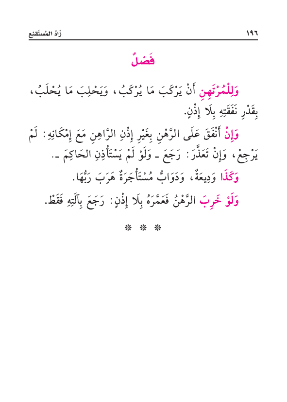وَلِلْمُرْتَهِنِ أَنْ يَرْكَبَ مَا يُرْكَبُ، وَيَحْلِبَ مَا يُحْلَبُ، بِقَدْرِ نَفَقَتِهِ بِلَا إِذْنٍ.