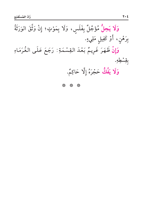 وَلَا يَحِلُّ مُؤَجَّلٌ بِفَلَسٍ، وَلَا بِمَوْتٍ؛ إِنْ وَثَّقَ الوَرَثَةُ بِرَهْنٍ، أَوْ كَفِيلٍ مَلِيءٍ.