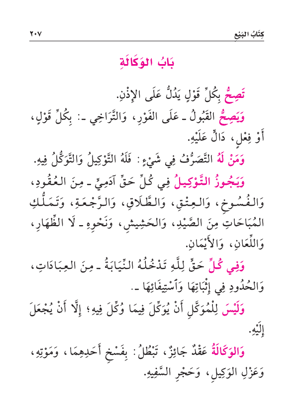 وَيَجُوزُ التَّوْكِيلُ فِي كُلِّ حَقِّ آدَمِيٍّ - مِنَ العُقُودِ، وَالفُسُوخِ، وَالعِتْقِ، وَالطَّلَاقِ، وَالرَّجْعَةِ، وَتَمَلُّكِ المُبَاحَاتِ مِنَ الصَّيْدِ، وَالحَشِيشِ، وَنَحْوِهِ - لَا الظِّهَارِ وَاللِّعَانِ وَالأَيْمَانِ.