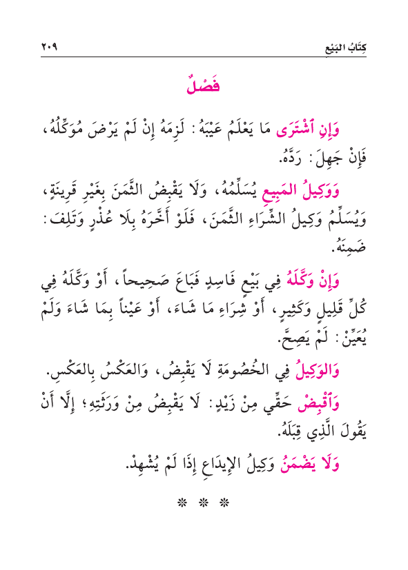 وَوَكِيلُ المَبِيعِ يُسَلِّمُهُ، وَلَا يَقْبِضُ الثَّمَنَ بِغَيْرِ قَرِينَةٍ، وَيُسَلِّمُ وَكِيلُ الشِّرَاءِ الثَّمَنَ، فَلَوْ أَخَّرَهُ بِلَا عُذْرٍ وَتَلِفَ: ضَمِنَهُ.