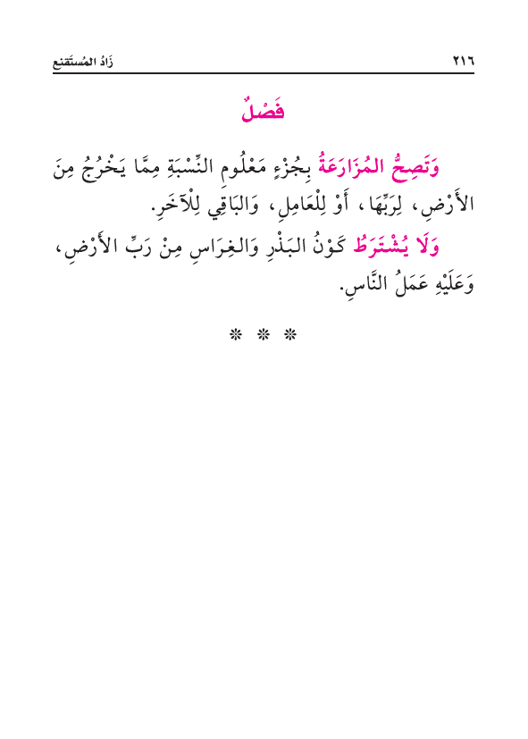 وَتَصِحُّ المُزَارَعَةُ بِجُزْءٍ مَعْلُومِ النِّسْبَةِ مِمَّا يَخْرُجُ مِنَ الأَرْضِ، لِرَبِّهَا، أَوْ لِلْعَامِلِ، وَالبَاقِي لِلْآخَرِ.
