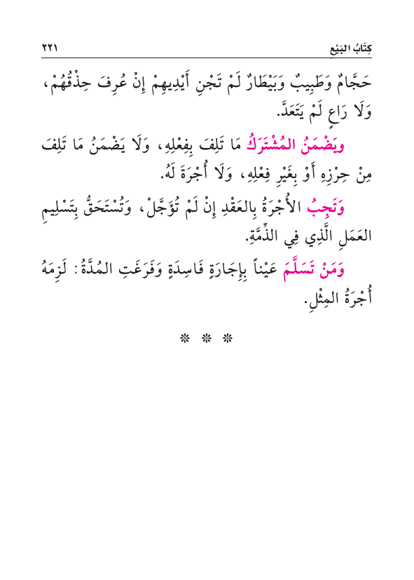 وَتَجِبُ الأُجْرَةُ بِالعَقْدِ إِنْ لَمْ تُؤَجَّلْ، وَتُسْتَحَقُّ بِتَسْلِيمِ العَمَلِ الَّذِي فِي الذِّمَّةِ.