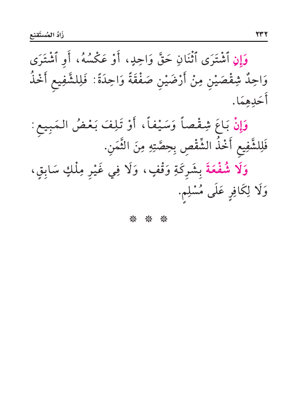 وَلَا شُفْعَةَ بِشَرِكَةِ وَقْفٍ، وَلَا فِي غَيْرِ مِلْكٍ سَابِقٍ، وَلَا لِكَافِرٍ عَلَى مُسْلِمٍ.