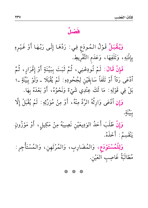 وَيُقْبَلُ قَوْلُ المُودَعِ: فِي رَدِّهَا إِلَى رَبِّهَا أَوْ غَيْرِهِ بِإِذْنِهِ، وَتَلَفِهَا، وَعَدَمِ التَّفْرِيطِ.