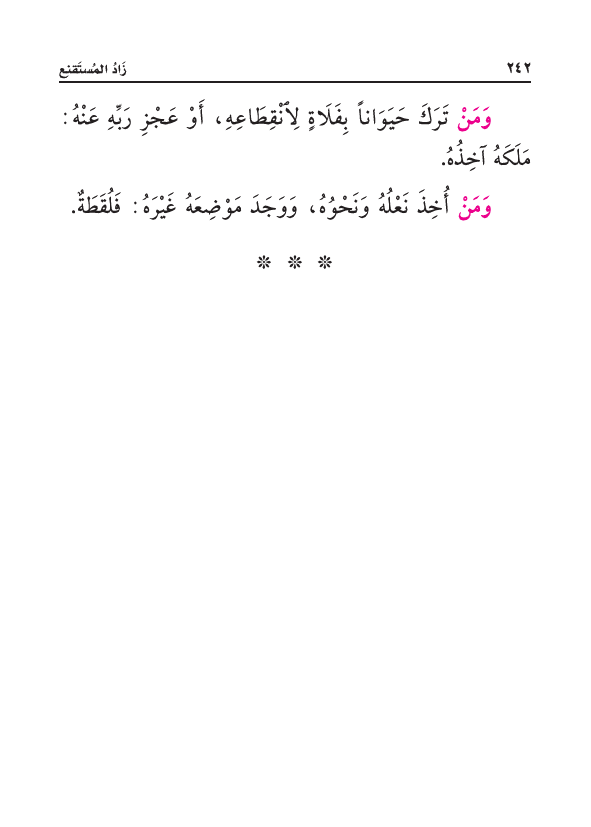 وَمَنْ تَرَكَ حَيَوَانًا بِفَلَاةٍ لِانْقِطَاعِهِ، أَوْ عَجْزِ رَبِّهِ عَنْهُ: مَلَكَهُ آخِذُهُ.