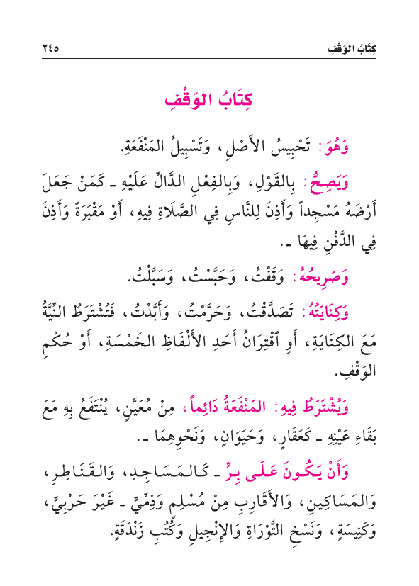 وَأَنْ يَكُونَ عَلَى بِرٍّ - كَالمَسَاجِدِ، وَالقَنَاطِرِ، وَالمَسَاكِينِ، وَالأَقَارِبِ مِنْ مُسْلِمٍ وَذِمِّيٍّ - غَيْرَ حَرْبِيٍّ، وَكَنِيسَةٍ، وَنَسْخِ التَّوْرَاةِ وَالإِنْجِيلِ وَكُتُبِ زَنْدَقَةٍ.
