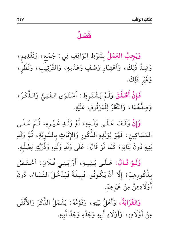 وَيَجِبُ العَمَلُ بِشَرْطِ الوَاقِفِ: فِي جَمْعٍ، وَتَقْدِيمٍ، وَضِدِّ ذَلِكَ، وَاعْتِبَارِ وَصْفٍ وَعَدَمِهِ، وَالتَّرْتِيبِ، وَنَظَرٍ، وَغَيْرِ ذَلِكَ.