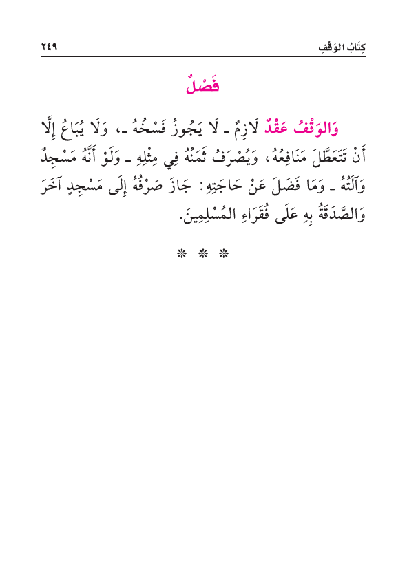 وَالوَقْفُ عَقْدٌ لَازِمٌ - لَا يَجُوزُ فَسْخُهُ - وَلَا يُبَاعُ إِلَّا أَنْ تَتَعَطَّلَ مَنَافِعُهُ، وَيُصْرَفُ ثَمَنُهُ فِي مِثْلِهِ - وَلَوْ أَنَّهُ مَسْجِدٌ وَآلَتُهُ - وَمَا فَضَلَ عَنْ حَاجَتِهِ: جَازَ صَرْفُهُ إِلَى مَسْجِدٍ آخَرَ وَالصَّدَقَةُ بِهِ عَلَى فُقَرَاءِ المُسْلِمِينَ.