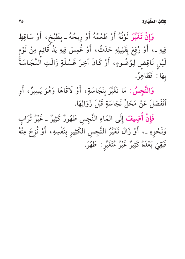 فَإِنْ أُضِيفَ إِلَى المَاءِ النَّجِسِ طَهُورٌ كَثِيرٌ - غَيْرُ تُرَابٍ وَنَحْوِهِ -، أَوْ زَالَ تَغَيُّرُ النَّجِسِ الكَثِيرِ بِنَفْسِهِ، أَوْ نُزِحَ مِنْهُ فَبَقِيَ بَعْدَهُ كَثِيرٌ غَيْرُ مُتَغَيِّرٍ: طَهُرَ.