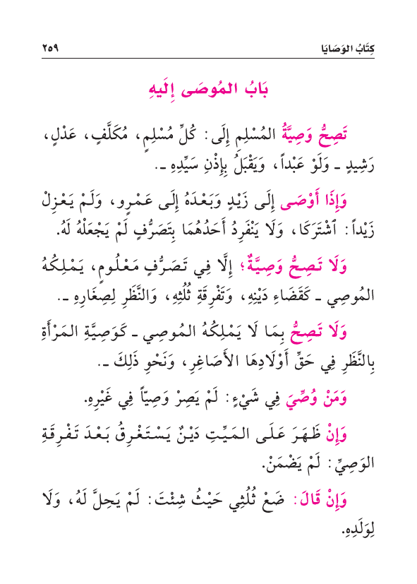تَصِحُّ وَصِيَّةُ المُسْلِمِ إِلَى: كُلِّ مُسْلِمٍ، مُكَلَّفٍ، عَدْلٍ، رَشِيدٍ - وَلَوْ عَبْداً وَيَقْبَلُ بِإِذْنِ سَيِّدِهِ -.