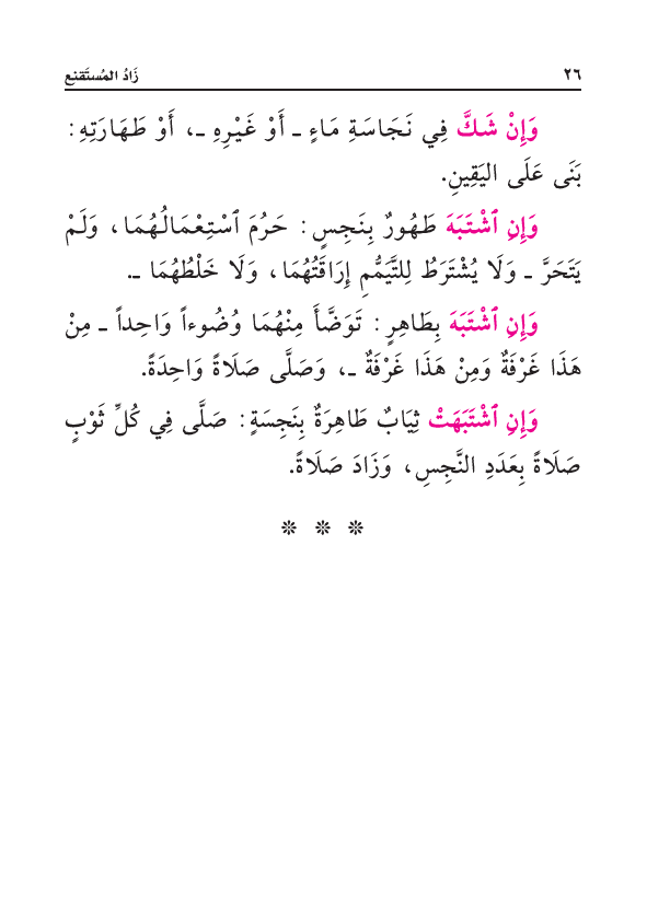 وَإِنْ شَكَّ فِي نَجَاسَةِ مَاءٍ - أَوْ غَيْرِهِ -، أَوْ طَهَارَتِهِ: بَنَى عَلَى اليَقِينِ.