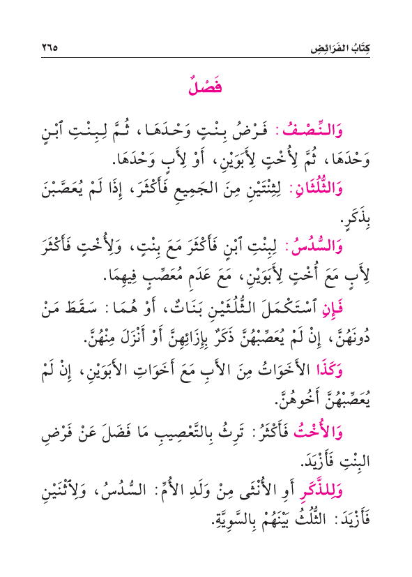 وَالسُّدُسُ: لِبِنْتِ ابْنٍ فَأَكْثَرَ مَعَ بِنْتٍ، وَلِأُخْتٍ فَأَكْثَرَ لِأَبٍ مَعَ أُخْتٍ لِأَبَوَيْنِ، مَعَ عَدَمِ مُعَصِّبٍ فِيهِمَا.