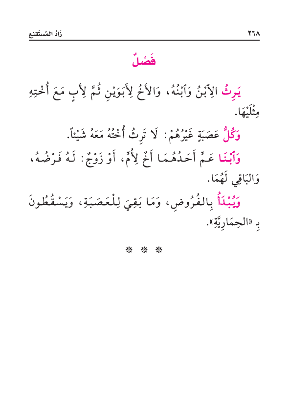 يَرِثُ الِابْنُ وَابْنُهُ، وَالأَخُ لِأَبَوَيْنِ ثُمَّ لِأَبٍ مَعَ أُخْتِهِ مِثْلَيْهَا.