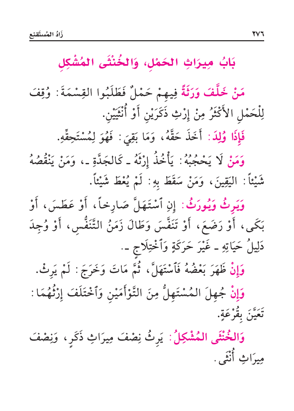 مَنْ خَلَّفَ وَرَثَةً فِيهِمْ حَمْلٌ فَطَلَبُوا القِسْمَةَ: وُقِفَ لِلْحَمْلِ الأَكْثَرُ مِنْ إِرْثِ ذَكَرَيْنِ أَوْ أُنْثَيَيْنِ.