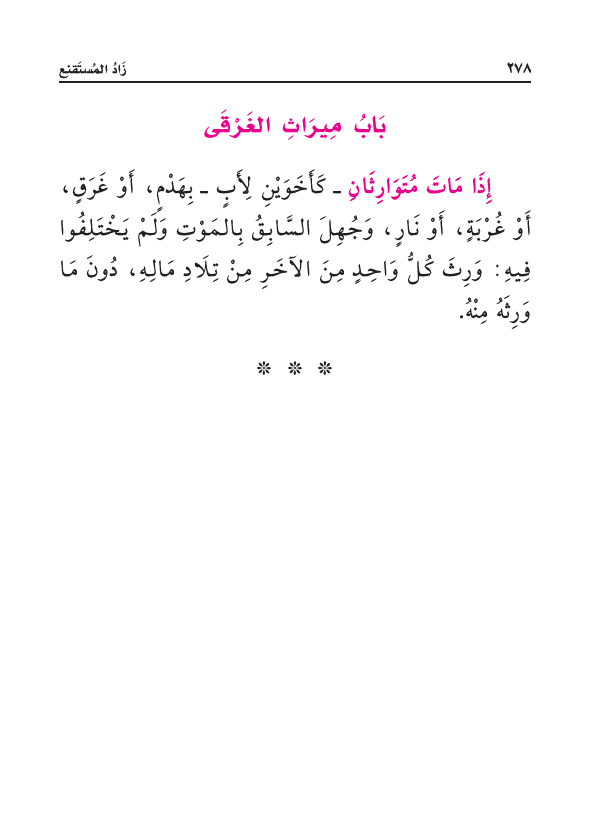 إِذَا مَاتَ مُتَوَارِثَانِ - كَأَخَوَيْنِ لِأَبٍ - بِهَدْمٍ، أَوْ غَرَقٍ، أَوْ غُرْبَةٍ، أَوْ نَارٍ، وَجُهِلَ السَّابِقُ بِالمَوْتِ وَلَمْ يَخْتَلِفُوا فِيهِ: وَرِثَ كُلُّ وَاحِدٍ مِنَ الآخَرِ مِنْ تِلَادِ مَالِهِ، دُونَ مَا وَرِثَهُ مِنْهُ.