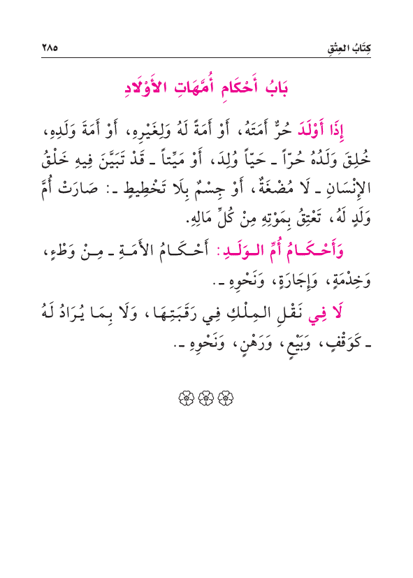 إِذَا أَوْلَدَ حُرٌّ أَمَتَهُ، أَوْ أَمَةً لَهُ وَلِغَيْرِهِ، أَوْ أَمَةَ وَلَدِهِ، خُلِقَ وَلَدُهُ حُرّاً - حَيّاً وُلِدَ أَوْ مَيِّتاً - قَدْ تَبَيَّنَ فِيهِ خَلْقُ الإِنْسَانِ - لَا مُضْغَةٌ، أَوْ جِسْمٌ بِلَا تَخْطِيطٍ -: صَارَتْ أُمَّ وَلَدٍ لَهُ، تُعْتَقُ بِمَوْتِهِ مِنْ كُلِّ مَالِهِ.