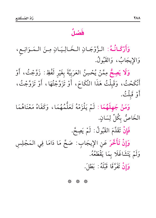 وَلَا يَصِحُّ مِمَّنْ يُحْسِنُ العَرَبِيَّةَ بِغَيْرِ لَفْظِ: زَوَّجْتُ أَوْ أَنْكَحْتُ. وَقَبِلْتُ هَذَا النِّكَاحَ، أَوْ تَزَوَّجْتُهَا، أَوْ تَزَوَّجْتُ، أَوْ قَبِلْتُ.