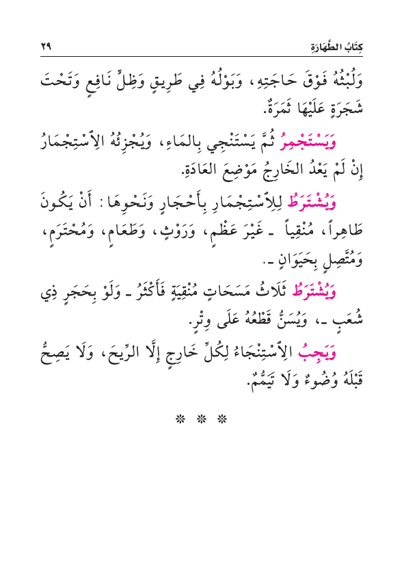 وَيُشْتَرَطُ لِلِاسْتِجْمَارِ بِأَحْجَارٍ وَنَحْوِهَا: أَنْ يَكُونَ طَاهِراً مُنْقِياً - غَيْرَ عَظْمٍ وَرَوْثٍ، وَطَعَامٍ، وَمُحْتَرَمٍ، وَمُتَّصِلٍ بِحَيَوَانٍ -.