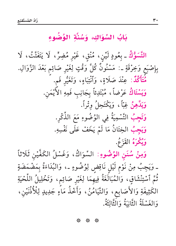 وَمِنْ سُنَنِ الوُضُوءِ: السِّوَاكُ، وَغَسْلُ الكَفَّيْنِ ثَلَاثاً - وَيَجِبُ مِنْ نَوْمِ لَيْلٍ نَاقِضٍ لِوُضُوءٍ -، وَالبُدَاءَةُ بِمَضْمَضَةٍ ثُمَّ اسْتِنْشَاقٍ، وَالمُبَالَغَةُ فِيهِمَا لِغَيْرِ صَائِمٍ، وَتَخْلِيلُ اللِّحْيَةِ الكَثِيفَةِ وَالأَصَابِعِ، وَالتَّيَامُنُ، وَأَخْذُ مَاءٍ جَدِيدٍ لِلْأُذُنَيْنِ، وَالغَسْلَةُ الثَّانِيَةُ وَالثَّالِثَةُ.