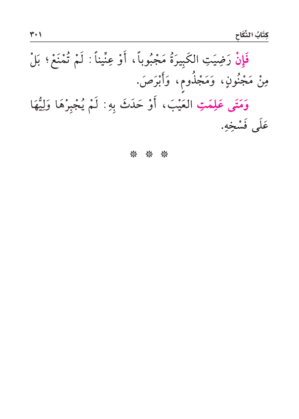 فَإِنْ رَضِيَتِ الكَبِيرَةُ مَجْبُوبًا، أَوْ عِنِّينًا: لَمْ تُمْنَعْ؛ بَلْ مِنْ مَجْنُونٍ، وَمَجْذُومٍ، وَأَبْرَصَ.