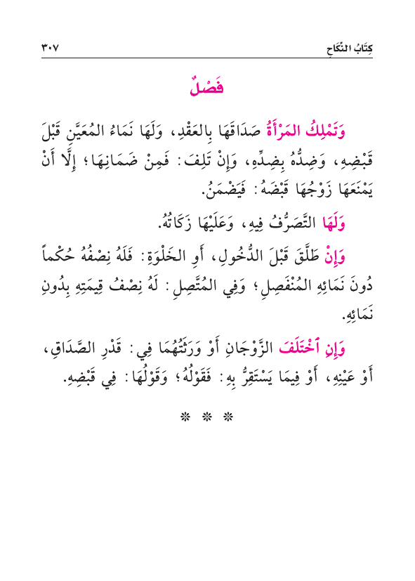 وَتَمْلِكُ المَرْأَةُ صَدَاقَهَا بِالعَقْدِ، وَلَهَا نَمَاءُ المُعَيَّنِ قَبْلَ قَبْضِهِ، وَضِدُّهُ بِضِدِّهِ، وَإِنْ تَلِفَ: فَمِنْ ضَمَانِهَا؛ إِلَّا أَنْ يَمْنَعَهَا زَوْجُهَا قَبْضَهُ: فَيَضْمَنُ.