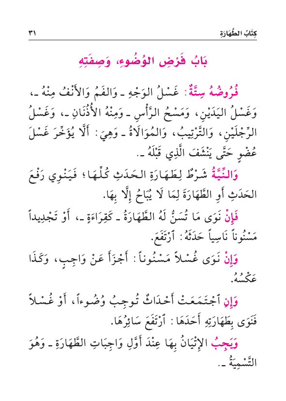 فُرُوضُهُ سِتَّةٌ: غَسْلُ الوَجْهِ - وَالفَمُ وَالأَنْفُ مِنْهُ -، وَغَسْلُ اليَدَيْنِ، وَمَسْحُ الرَّأْسِ - وَمِنْهُ الأُذُنَانِ -، وَغَسْلُ الرِّجْلَيْنِ، وَالتَّرْتِيبُ، وَالمُوَالَاةُ - وَهِيَ: أَلَّا يُؤَخِّرَ غَسْلَ عُضْوٍ حَتَّى يَنْشَفَ الَّذِي قَبْلَهُ -.